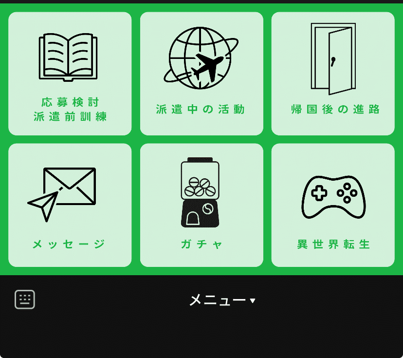 こちらは、青年海外協力隊に興味がある、訓練生活について知りたい人のボタンです。生活とお金・情報の集め方・訓練の実態・不安と迷い・選考と準備のカテゴリ別に、応募前にお悩みの方の質問と回答を詰め込みました。押してもらうことで、リード文がでてくるのでそれに従って知りたい情報を選んでください。