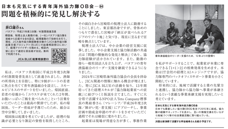 今回のゲストは、 帰国後に税理士法人勤務の後、(一社)バヌアツ協力隊を宮崎から応援する会を設立、経理業務のIT効率化を行うと共に、JICA海外協力隊経験者対象の「JICA海外協力隊起業支援プロジェクト( BLUE)」の起業相談窓口において、経理アドバイザーを務められている井口雄介さん(平成21年3次隊/バヌアツ/村落開発)です。