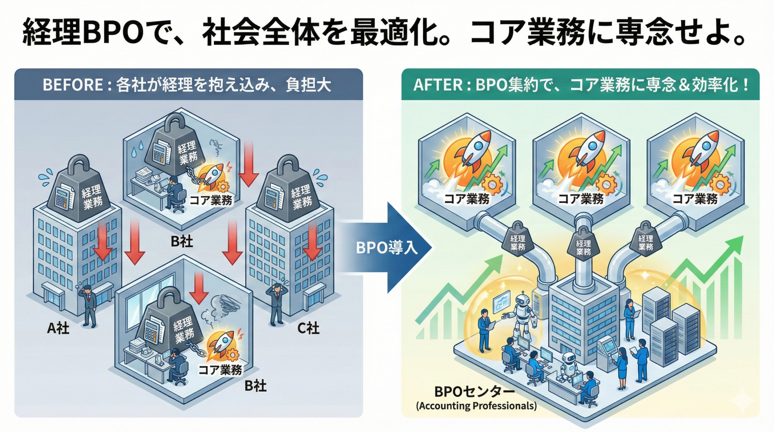 このノンコア業務をうまく切り離しても機能すれば、会社はコア業務に専念でき、バックオフィスの代行会社はノンコア業務の効率化にひたすら専念できます。